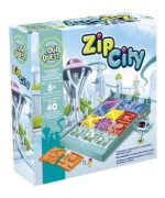 Zip City es un juego de rompecabezas en el que organizas losetas cuadradas, que representan las vías de la ciudad, en un tablero de juego inclinado con caminos conectados que permiten a las esferas zip, en forma de canicas, viajar todo el camino según los desafíos que aparezcan en las cartas de rompecabezas.